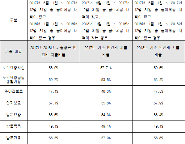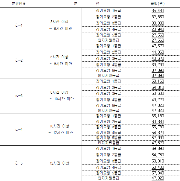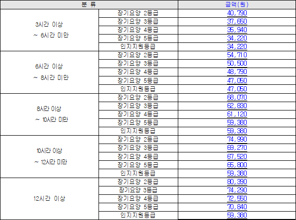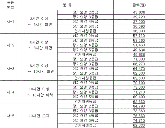 이번에는 각 월급의 급여 수치도 인상되었습니다. 요양시설1의 비용은 74,850원에서 78,250원으로 인상되었습니다. 30일 사용 기준 총 임금은 2,347,500원이며, 수혜자는 46,500원을 부담하게 됩니다.