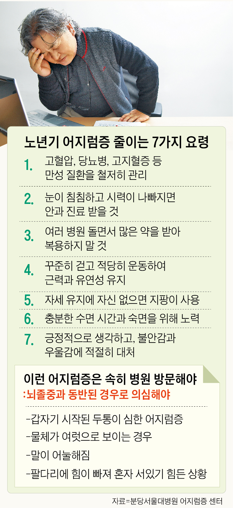 어지럼증은 귓속이나 두뇌와 관련성이 깊습니다. 어지럼증을 대표하는 이석증은 귓속에 정상적으로 존재하는 칼슘 덩어리가 떨어지면서 일어납니다.보통 아침에 갑자기 기상하면 천장이 빙글빙글 도는 것처럼 어지럽고 구역질이 난다고 합니다.