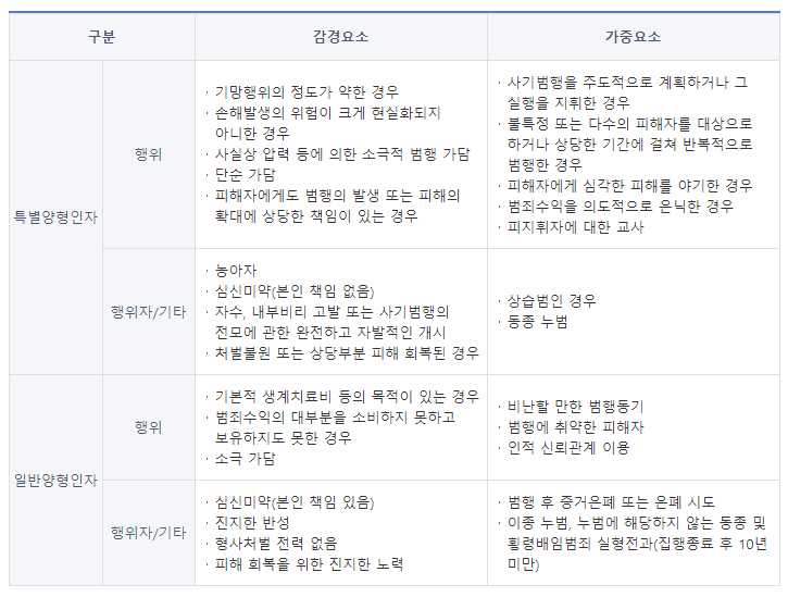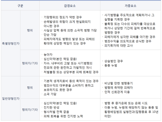 1. 범죄유형의 분류 사기사건의 경우 ‘범죄유형’을 사기금액에 따라 5단계로 구분(이렇게 하여 ‘기초’ 형량을 정하고 ‘감형’과 ‘가중’도 아래를 보시면 아시겠지만, 적용되는 형량 범위는 편취한 금액을 기준으로 합니다(그래서 재산범죄는 범죄금액이 양형의 기준이 됩니다).