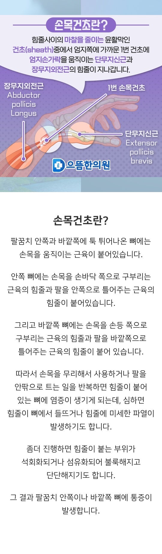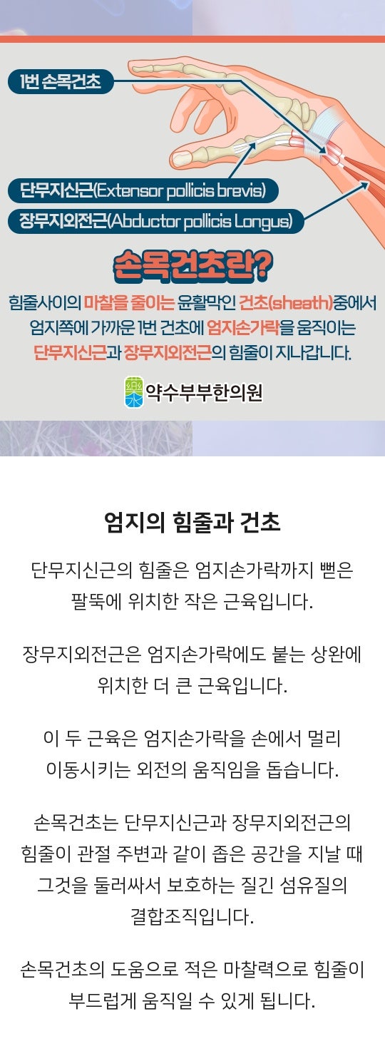 사람의 손가락을 움직이는 근육은 손가락에 있는 것이 아니라 꼭두각시 인형극처럼 팔꿈치와 팔뚝에서 시작하여 손가락에 힘줄만 붙이고 힘줄을 잡아당겨 손가락을 움직인다. 힘줄을 부드럽게 하기 위해 부르사는 힘줄을 보호하는 윤활 주머니입니다. 엄지손가락을 연결하는 두 개의 힘줄을 단무지신근(extensor pollicis brevis)과 장무지신근(extensor pollicis longus)이라고 합니다. 손가락 확장을 담당합니다.