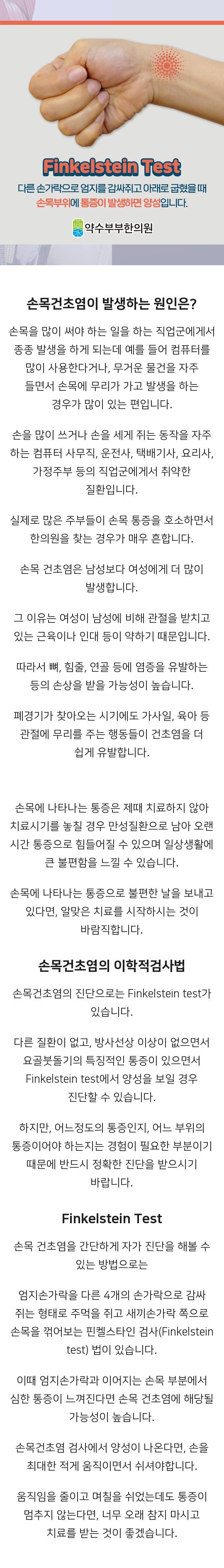 손가락을 과도하게 사용하여 발생하는 질환으로 선천성 힘줄을 한도를 넘어 과도하게 사용하여 발생하며 체력이 약한 주부들에게 주로 발생합니다. 건초는 일반적입니다. 증상에는 염증과 섬유종이 포함됩니다.손목 힘줄염 – Finkelstein 테스트