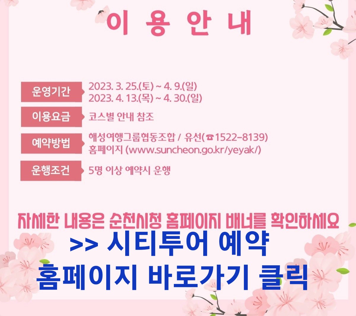순천역 낙안읍성 선암사 상사호 벚꽃길(승차) 동천 벚꽃길(도보 : 장대공원 → 동천방조제 → 동천 출렁다리) 순천역