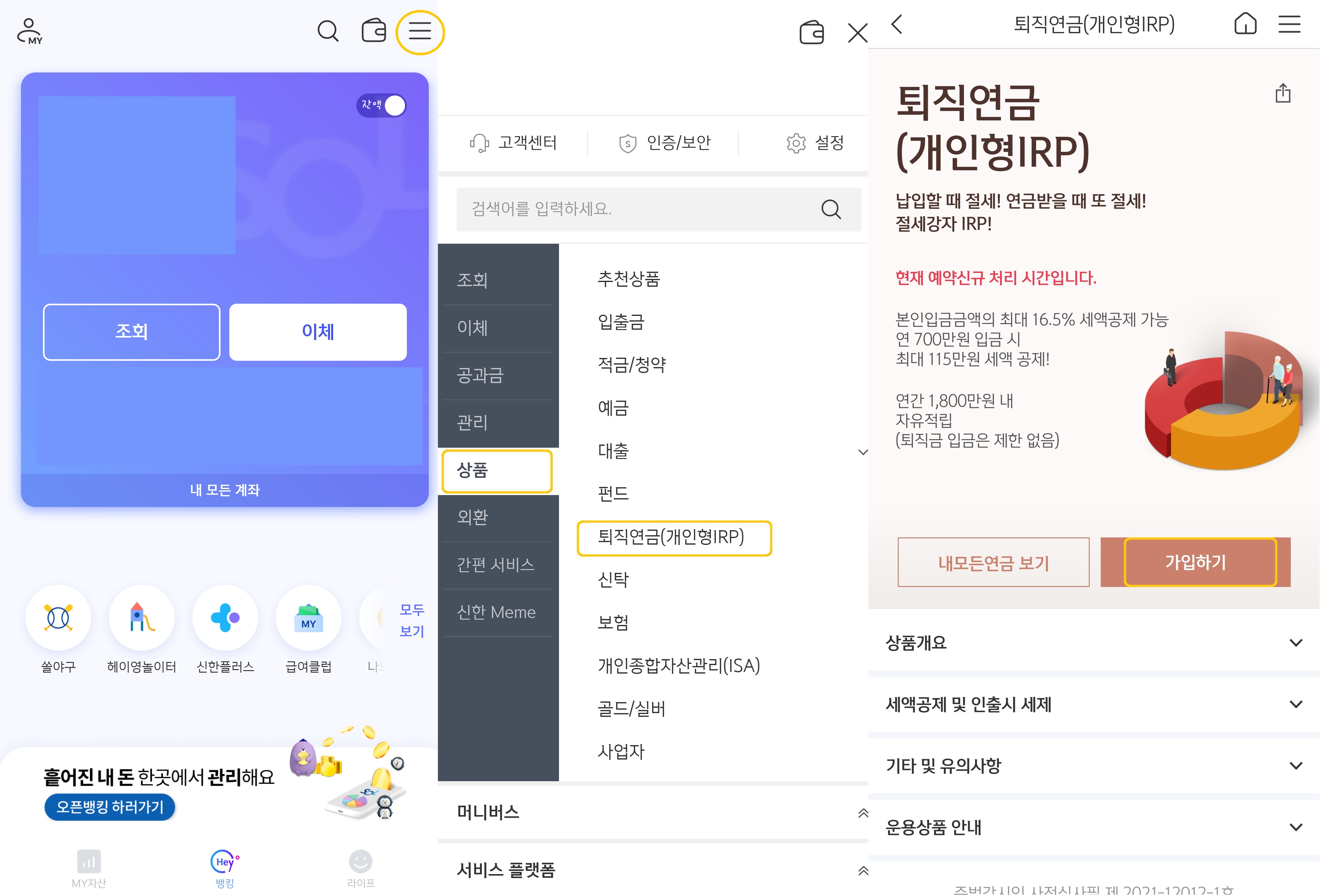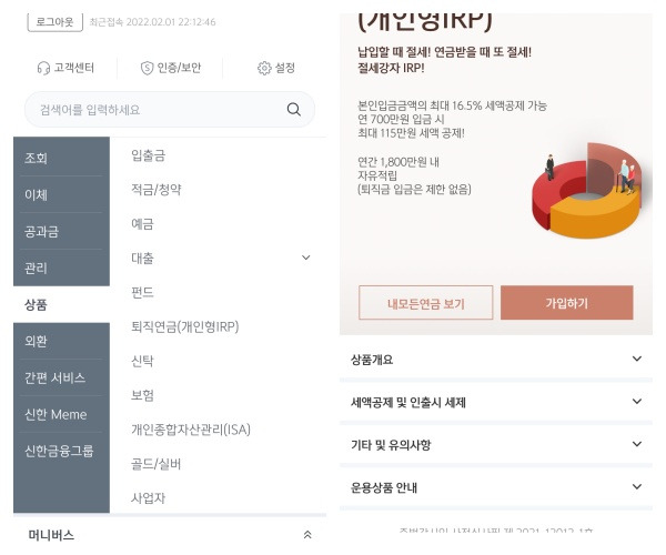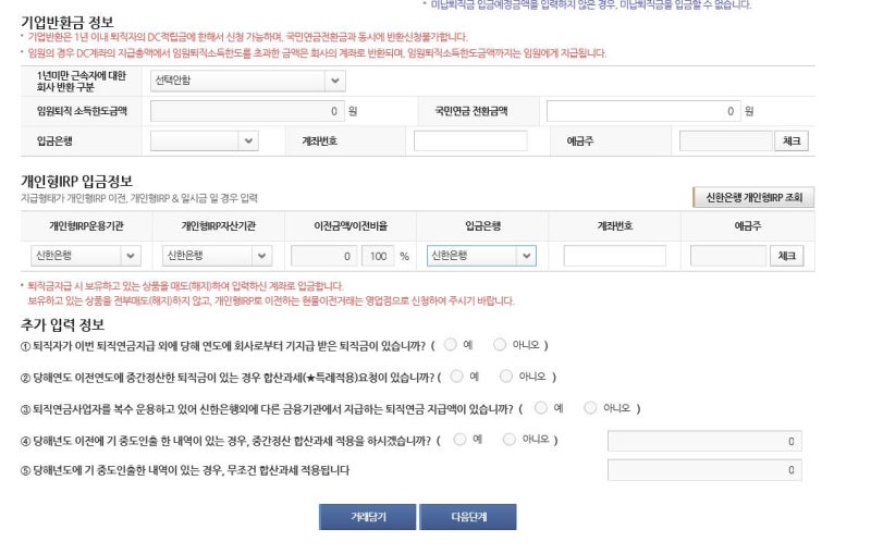 신한은행 퇴직연금 개인형 IRP 가입방법 솔로로그인> 우측 하단 전체메뉴(가)> 상품> 퇴직연금(개인형 IRP)> 가입> 계약서 및 설명서+약관동의> 직접등록 다음> 예금상품선택> 상품명에 [현금] 넣고 조회> (시장금리 연동형) 현금성대기자산_2013 선택완료> 투자비율 100%+투자설명서 전체동의+[필수] 자동이체 약관+고객 유의사항 확인> (가)(B)중 원하는 방법으로 선택(가) 입금여부 : 0원 신규탭> 비대면 실명인증(신계좌인증) 동저축 :