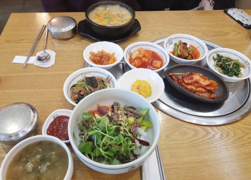 한우불고기, 수제두부전골, A++ 소고기 양지머리 등을 파는 메뉴도 있지만 점심값이 비싸서 메뉴로 먹습니다~ (한우사골만두국, 한우비빔밥, 카스 선택하다!)