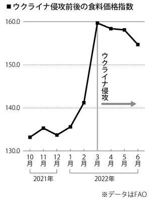 밀, 대두, 옥수수 등 곡물 가격은 우크라이나 침공 이후 급등했고, 곡물 가격 상승은 동물 사료 가격 상승을 통해 육류, 유제품, 식물성 기름 가격으로 전이되어 가격 상승을 주도했습니다. 유엔식량농업기구(FAO) 지수는 침공 직후인 3월 사상 최고치를 기록했다.